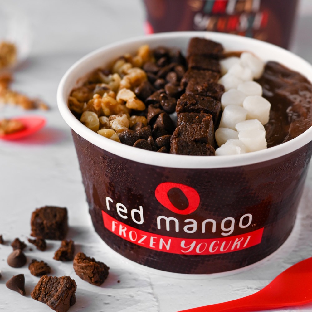 1 pint (16 oz.) of Red Mango’s best-selling Original Frozen Yogurt topped with Chocolate Shell, Hershey’s Choco Chips, Brownie Bites, Mochi Balls, and Walnuts.